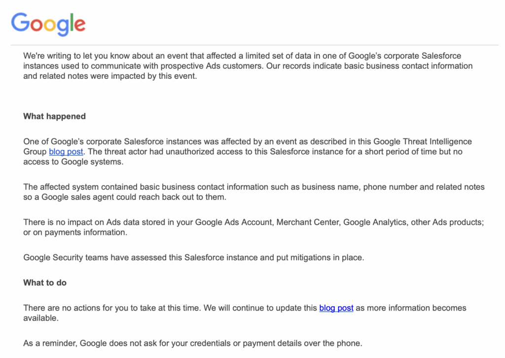 Google beschwichtigt, der Schaden sei „begrenzt“ und „keine Kernsysteme“ seien betroffen. Aber machen wir uns nichts vor: Wenn du ihnen deine private Handynummer gegeben hast (und sie zwingen dich dazu, siehe oben), ist es sicher kein großer Gedankensprung anzunehmen, dass sie mit abgesaugt wurde. Ausdrücklich sagen es die Verantwortlichen bei Google nicht. Aber warum sollten sie auch?